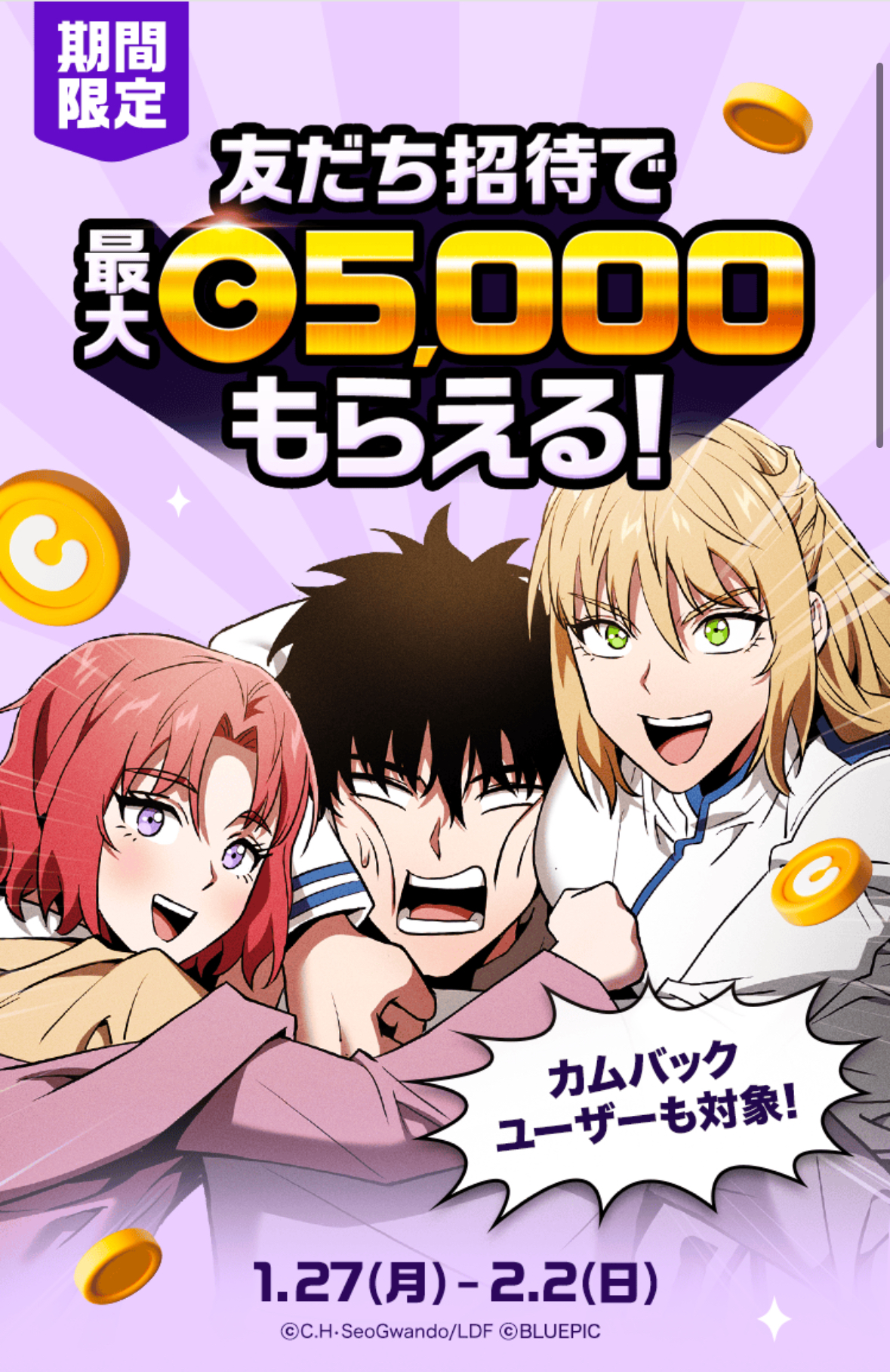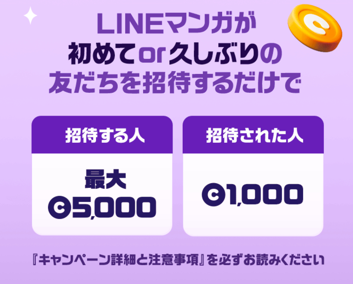 期間限定で友達招待やお久しぶりの方限定でLINEマンガで使える1,000コインがもらえます!
